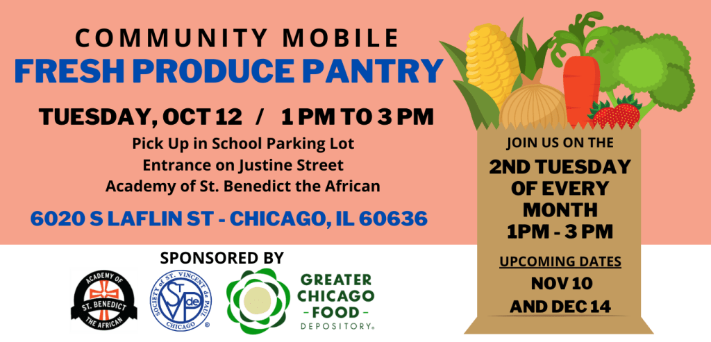 SVdP Chicago, in partnership with the Academy of St. Benedict the African and the Greater Chicago Food Depository is hosting a Mobile Produce Pantry on Tuesday, October 12, 2021, from 1:00pm – 3:00pm. All who are in need within the community are welcome! The event takes place in the school parking lot, entrance is on Justine St. For driving directions, please use the school’s address 6020 S. Laflin Avenue, Chicago, IL 60636.If you would like to volunteer to help us in our efforts to set up, distribute food items, and clean up, please contact us! You can call the main office at (773) 779-6700 or email Teresa Stack at teresa@svdpchicago.org.