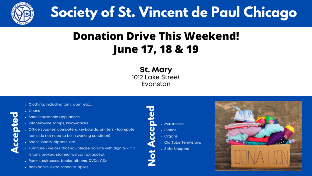 Join us this weekend for a 3-Day Donation Drive at St. Mary, 1012 Lake Street in Evanston.