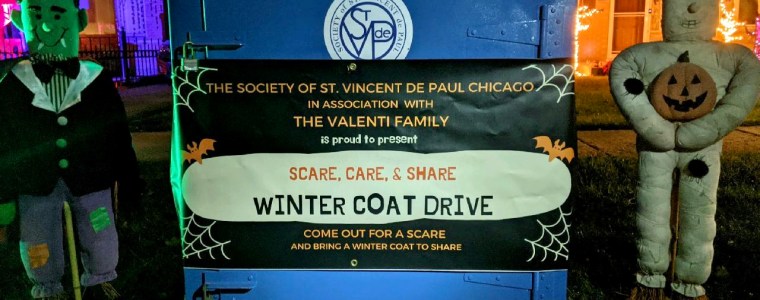 The Society of St. Vincent de Paul has already started the giving season by distributing Winter Coats to those in need at the Pope Francis Center and the Homeless Shelter at 71st & Kedzie. SVdP, in association with the Valenti Family, hosted a Scare, Care & Share Winter Coat Drive at their home in Chicago Ridge during the Halloween Season in October. With the outpouring of support from friends, family, neighbors and visitors, they were able to collect almost 200 winter coats, 50 windbreakers, sweatshirts, sweaters along with hats, gloves and scarves. In addition, Catholic Charities was able to support our drive with a donation of 300 winter coats as well! These winter coats came at just the right time to help keep our friends in need warm through this upcoming frigid Chicago winter!